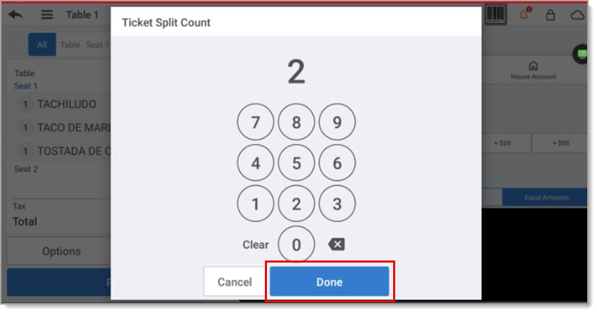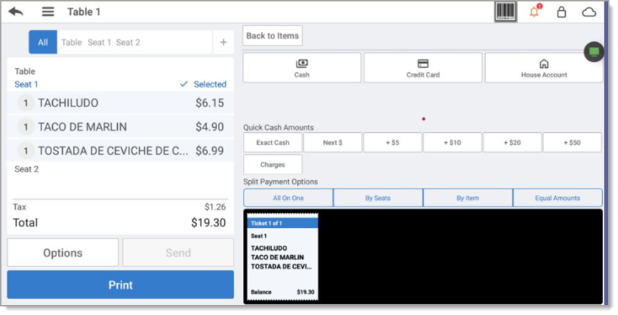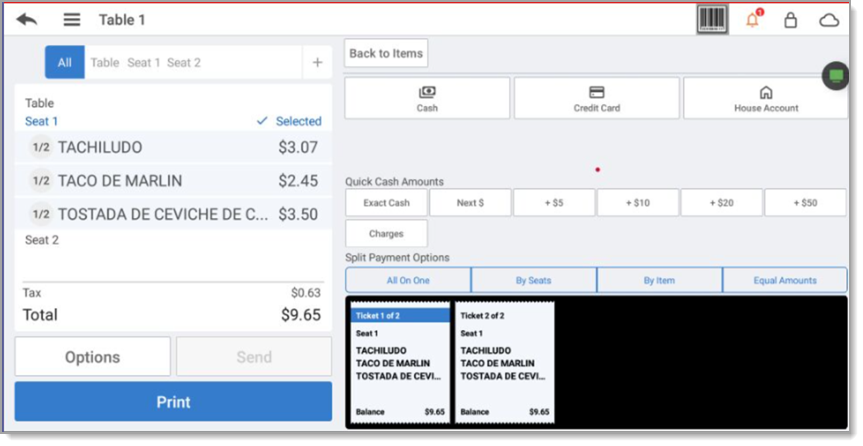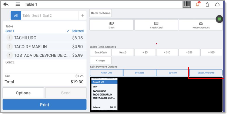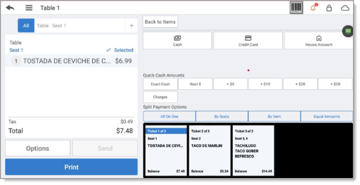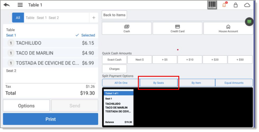 - Tap By Seats. The split check screen appears.