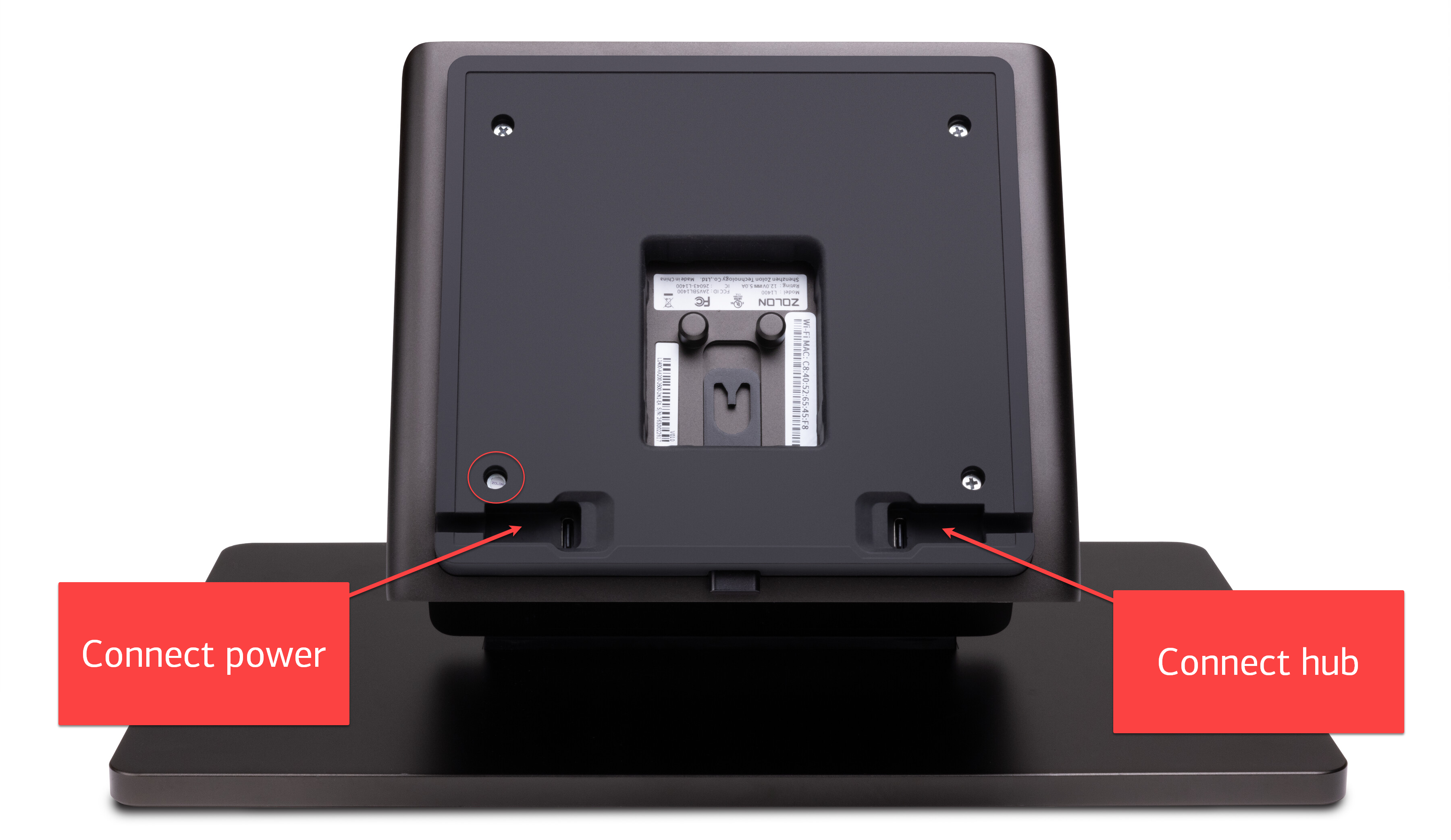 Insert the USB power cord connector into the USB port on the bottom of the terminal. A small white sticker covers the screw next to the power port. Insert the Communication Hub L1400/A3700P USB connector into the other port. Connect the power adapter to the power cord. Confirm that all connections are complete and secure, then plug the power adapter into a power outlet.